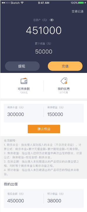 1、待收本金:指出借人实际投入的本金(即剩余本金),待收本金=累计充值金额-累计提现金额-可用余额。