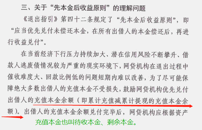 敲黑板啦,根据《《深圳市网络借贷信息中介机构良性退出指引》有关问题的说明》第三条规定:本金等于累计充值减去累计提现,也叫作剩余本金、待收本金或充值本金!这里的本金代表的是财迷实际投入的本钱,是大家实实在在的本金!