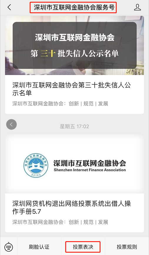1、打开微信,搜索“深圳市互联网金融协会服务号”,选择“投票表决”,进入投票系统。(进入方式和监委会投票相同)