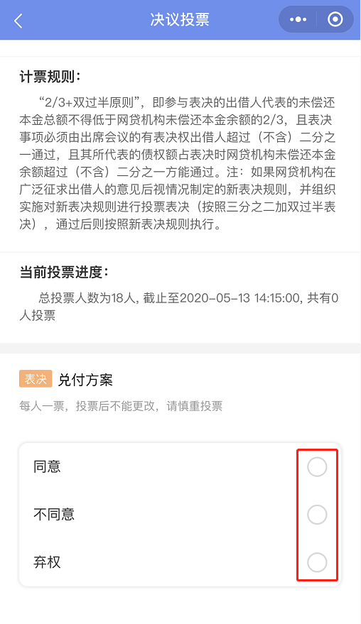 人人聚财兑付方案投票。财迷们可在深圳市互联网金融协会投票系统(“互金协会投票系统”)查看兑付方案。