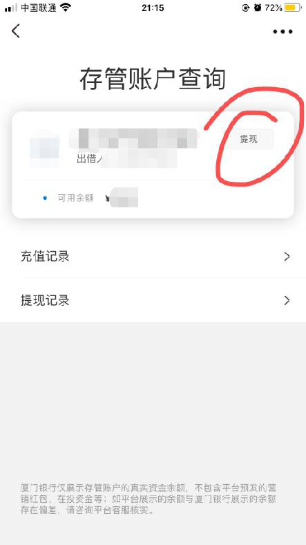 5、出借人点击页面进入存管查询页面,点击余额右侧的提现按钮,进入提现页面。