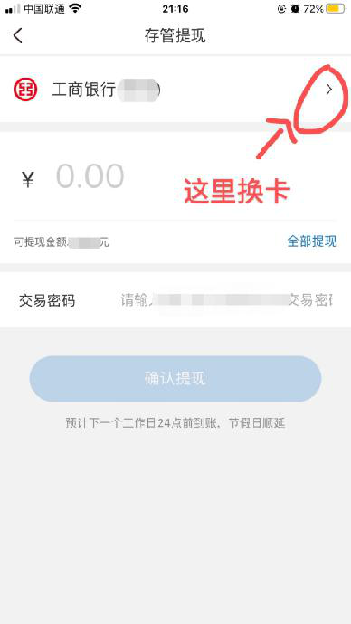 6、提现页面输入提现金额,验证交易密码即可受理提现,到账时效为 T+1,即下一个工作日到账。提现页面支持出借人更换绑定卡提现,更换绑定卡需要进行人脸识别,新的银行卡需要提前绑定厦 e 站,厦 e 站绑定卡需要五要素认证。