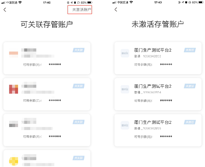2、【可关联存管账户】页面右上角点击【未激活账户】,进入【未激活存管账户】列表页面。只有清退处置期结束平台对应的未激活存管账户才能在这里查询到,可查询的平台通过白名单维护。