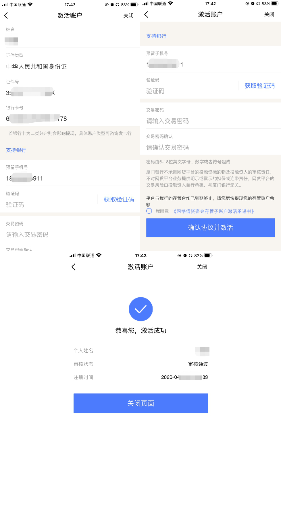 4、在【激活账户】页面,出借人确认自己在存管系统中的姓名、身份证号、银行卡号、银行卡预留手机号,并回填短信验证码,设置存管账户交易密码,勾选同意《网络借贷资金存管子账户激活承诺书》,点击【确认协议并激活】。存管系统将出借人信息进行四要素鉴权,鉴权通过完成存管子账户激活。