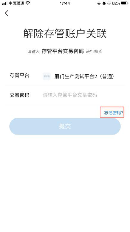 1、在厦 e 站存管查询模块中,关联存管账户、解除存管账户关联、提现三个页面输入存管交易密码框下方展示【忘记密码】选项。