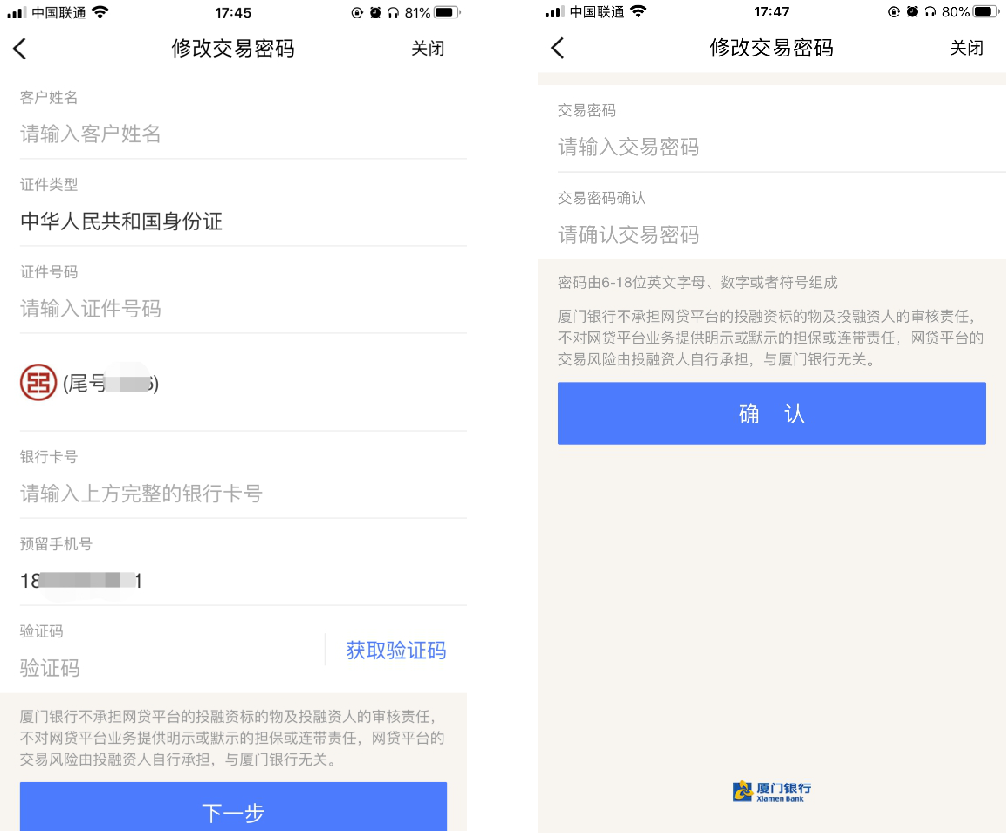 我行目前已经支持指定平台的出借人在厦 e 站重置交易密码,允许出借人重置交易密码的平台通过后台开关维护,详细步骤如下: